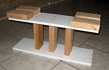 The stands are made from cut 2x4s and medium density fiberboard (MDF), which were simply screwed together. The 2×4 blocks on the top are arranged so that they cradle the understruts of the table, giving the stands a high level of stability. Only two stands are needed per table. As you can see, there was no need to finish the stands, as they are obscured by the tablecloth. The stands measure slightly more than a foot high.